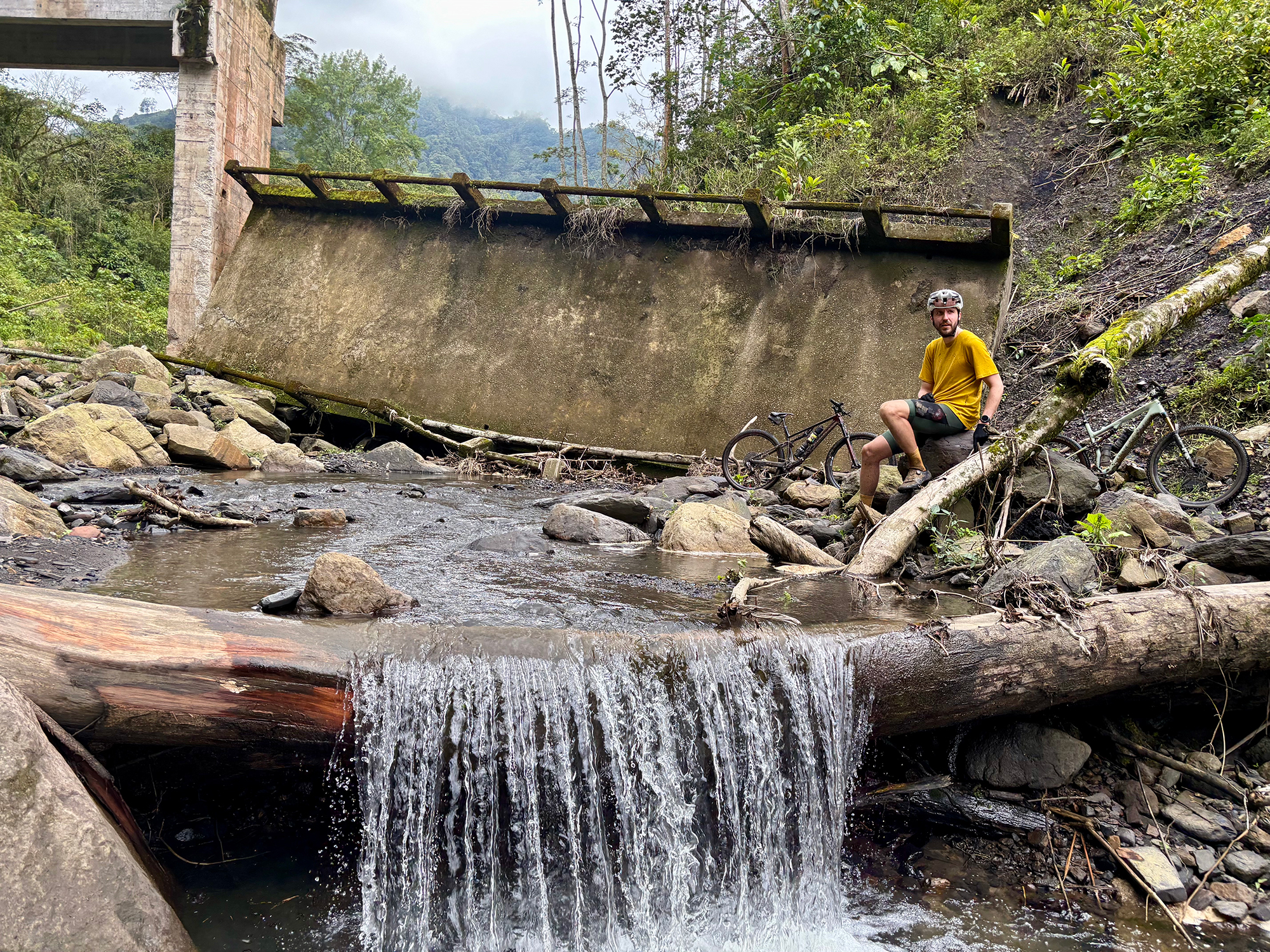 Twelve kilometres later, we found out why no one was using the road when we rounded a bend and rode onto a concrete bridge that spanned just the first half of a gorge. The part that used to span the other half was lying on the riverbed, 20m below us. After looking around for a couple of minutes, we found a track that led down into the gorge. It was a challenging hike-a-bike down to the river, past the intact but out of place bridge deck, and back up the other side.